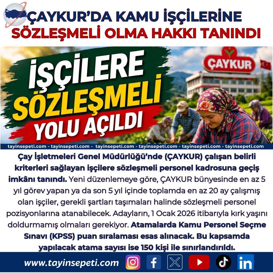 Çay İşletmeleri Genel Müdürlüğü’nde (ÇAYKUR) çalışan belirli kriterleri sağlayan işçilere sözleşmeli personel kadrosuna geçiş imkânı tanındı. Yeni düzenlemeye göre, ÇAYKUR bünyesinde en az 5 yıl görev yapan ya da son 5 yıl içinde toplamda en az 20 ay çalışmış olan işçiler, gerekli şartları taşımaları halinde sözleşmeli personel pozisyonlarına atanabilecek. Adayların, 1 Ocak 2026 itibarıyla kırk yaşını doldurmamış olmaları gerekiyor. Atamalarda Kamu Personel Seçme Sınavı (KPSS) puan sıralaması esas alınacak. Bu kapsamda yapılacak atama sayısı ise 150 kişi ile sınırlandırıldı.