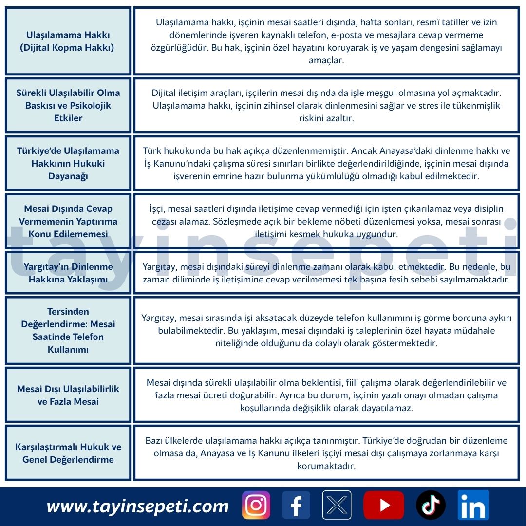 "Bazı ülkelerde ulaşılamama hakkı açıkça tanınmıştır. Türkiye’de doğrudan bir düzenleme olmasa da, Anayasa ve İş Kanunu ilkeleri işçiyi mesai dışı çalışmaya zorlanmaya karşı korumaktadır."