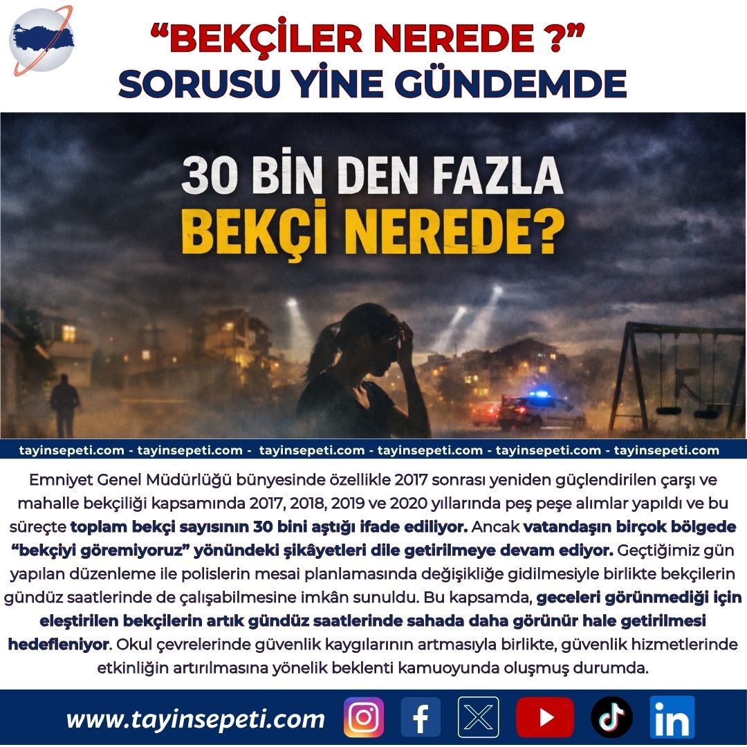 Emniyet Genel Müdürlüğü bünyesinde özellikle 2017 sonrası yeniden güçlendirilen çarşı ve mahalle bekçiliği kapsamında 2017, 2018, 2019 ve 2020 yıllarında peş peşe alımlar yapıldı ve bu süreçte toplam bekçi sayısının 30 bini aştığı ifade ediliyor. Ancak vatandaşın birçok bölgede “bekçiyi göremiyoruz” yönündeki şikâyetleri dile getirilmeye devam ediyor. Geçtiğimiz gün yapılan düzenleme ile polislerin mesai planlamasında değişikliğe gidilmesiyle birlikte bekçilerin gündüz saatlerinde de çalışabilmesine imkân sunuldu. Bu kapsamda, geceleri görünmediği için eleştirilen bekçilerin artık gündüz saatlerinde sahada daha görünür hale getirilmesi hedefleniyor. Okul çevrelerinde güvenlik kaygılarının artmasıyla birlikte, güvenlik hizmetlerinde etkinliğin artırılmasına yönelik beklenti kamuoyunda oluşmuş durumda.