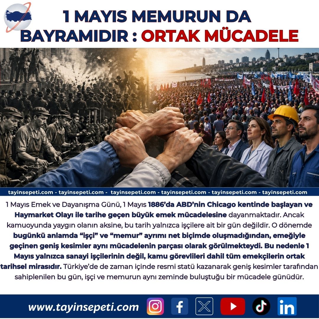 1 Mayıs Emek ve Dayanışma Günü, 1 Mayıs 1886’da ABD’nin Chicago kentinde başlayan ve Haymarket Olayı ile tarihe geçen büyük emek mücadelesine dayanmaktadır. Ancak kamuoyunda yaygın olanın aksine, bu tarih yalnızca işçilere ait bir gün değildir. O dönemde bugünkü anlamda “işçi” ve “memur” ayrımı net biçimde oluşmadığından, emeğiyle geçinen geniş kesimler aynı mücadelenin parçası olarak görülmekteydi. Bu nedenle 1 Mayıs yalnızca sanayi işçilerinin değil, kamu görevlileri dahil tüm emekçilerin ortak tarihsel mirasıdır. Türkiye’de de zaman içinde resmi statü kazanarak geniş kesimler tarafından sahiplenilen bu gün, işçi ve memurun aynı zeminde buluştuğu bir mücadele günüdür.