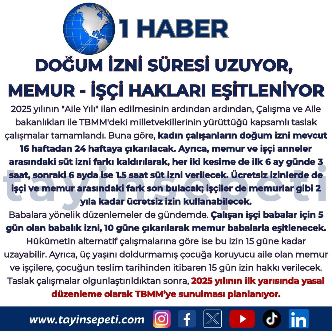 2025 yılının "Aile Yılı" ilan edilmesinin ardından ardından, Çalışma ve Aile bakanlıkları ile TBMM'deki milletvekillerinin yürüttüğü kapsamlı taslak çalışmalar tamamlandı. Buna göre, kadın çalışanların doğum izni mevcut 16 haftadan 24 haftaya çıkarılacak. Ayrıca, memur ve işçi anneler arasındaki süt izni farkı kaldırılarak, her iki kesime de ilk 6 ay günde 3 saat, sonraki 6 ayda ise 1.5 saat süt izni verilecek. Ücretsiz izinlerde de işçi ve memur arasındaki fark son bulacak; işçiler de memurlar gibi 2 yıla kadar ücretsiz izin kullanabilecek.
