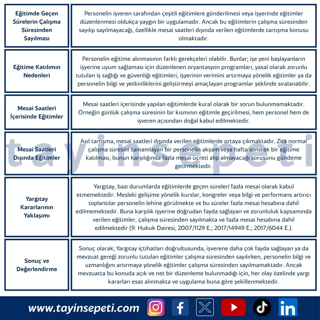 "Personelin işveren tarafından çeşitli eğitimlere gönderilmesi veya işyerinde eğitimler düzenlenmesi oldukça yaygın bir uygulamadır. Ancak bu eğitimlerin çalışma süresinden sayılıp sayılmayacağı, özellikle mesai saatleri dışında verilen eğitimlerde tartışma konusu olmaktadır."
