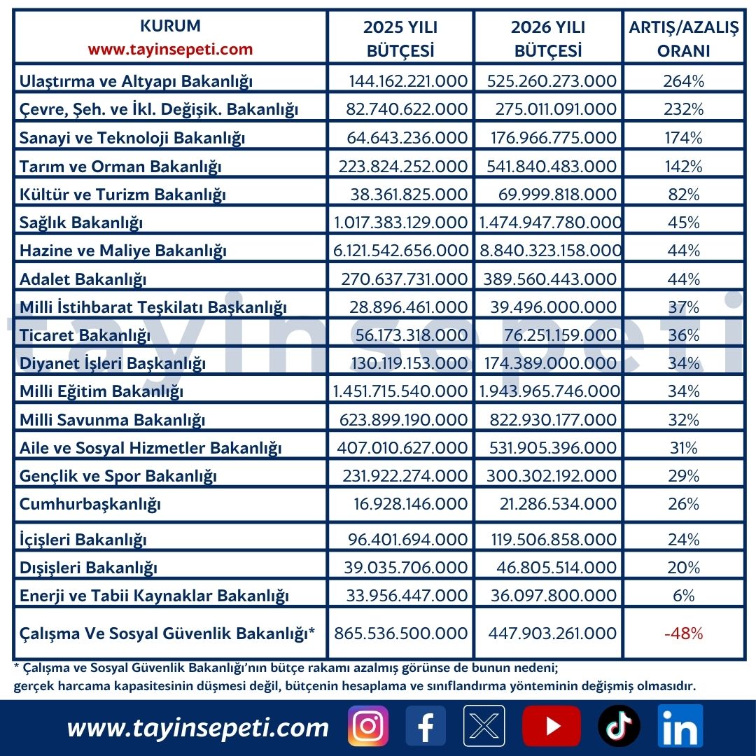 KAMU KURUMLARININ 2026 YILI BÜTÇELERİ - BAKANLIKLARIN 2025-2026 BÜTÇE KARŞILAŞTIRMASI