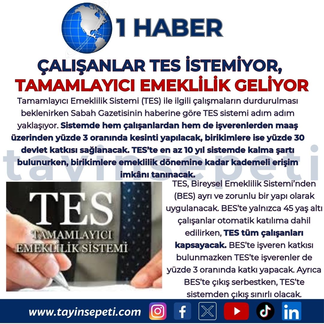 Tamamlayıcı Emeklilik Sistemi (TES) ile ilgili çalışmaların durdurulması beklenirken Sabah Gazetisinin haberine göre TES sistemi adım adım yaklaşıyor. Sistemde hem çalışanlardan hem de işverenlerden maaş üzerinden yüzde 3 oranında kesinti yapılacak, birikimlere ise yüzde 30 devlet katkısı sağlanacak. TES’te en az 10 yıl sistemde kalma şartı bulunurken, birikimlere emeklilik dönemine kadar kademeli erişim imkânı tanınacak.