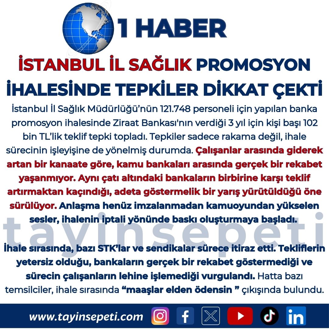 İstanbul İl Sağlık Müdürlüğü’nün 121.748 personeli için yapılan banka promosyon ihalesinde Ziraat Bankası'nın verdiği 3 yıl için kişi başı 102 bin TL’lik teklif tepki topladı. Tepkiler sadece rakama değil, ihale sürecinin işleyişine de yönelmiş durumda. Çalışanlar arasında giderek artan bir kanaate göre, kamu bankaları arasında gerçek bir rekabet yaşanmıyor. Aynı çatı altındaki bankaların birbirine karşı teklif artırmaktan kaçındığı, adeta göstermelik bir yarış yürütüldüğü öne sürülüyor. Anlaşma henüz imzalanmadan kamuoyundan yükselen sesler, ihalenin iptali yönünde baskı oluşturmaya başladı.