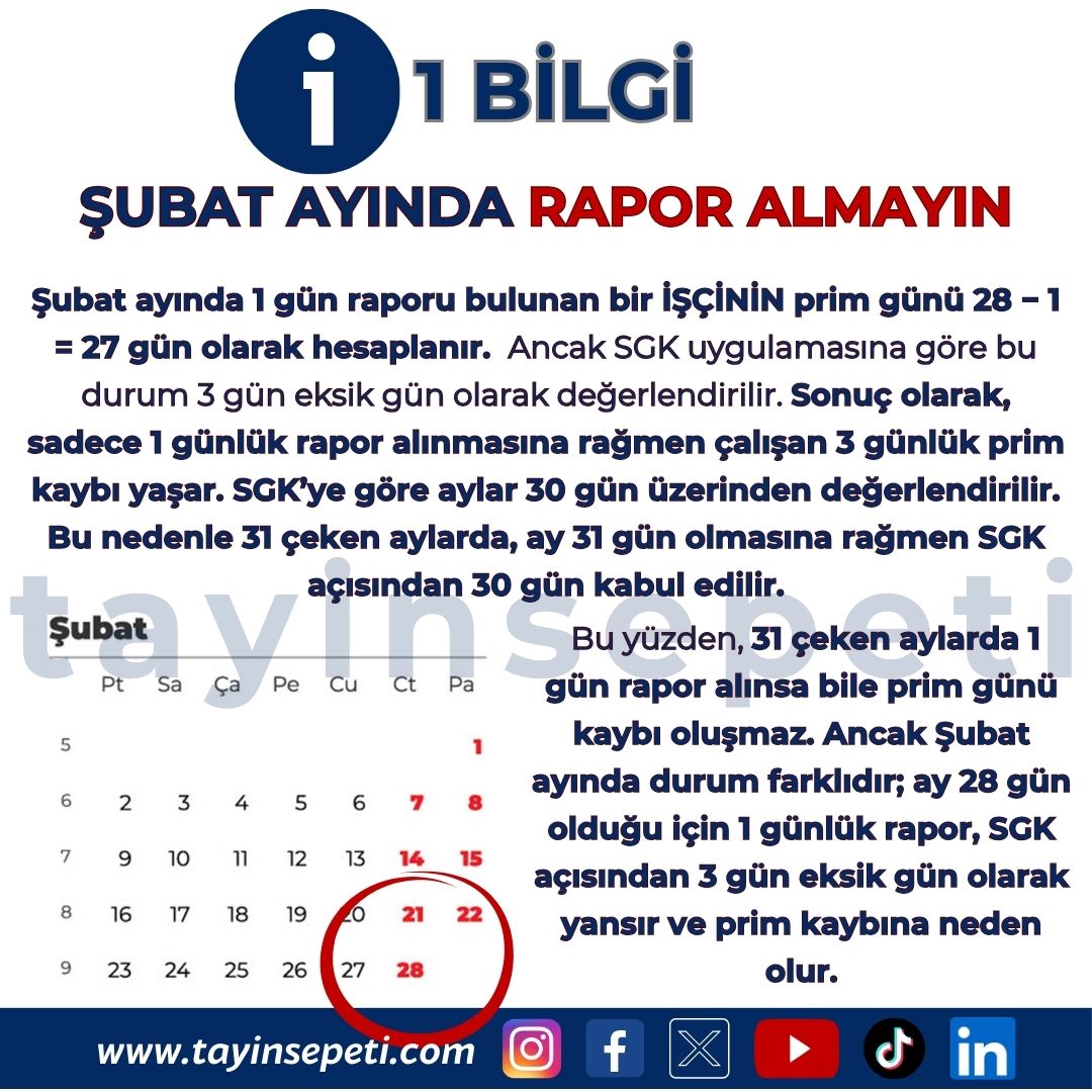 Bu yüzden, 31 çeken aylarda 1 gün rapor alınsa bile prim günü kaybı oluşmaz. Ancak Şubat ayında durum farklıdır; ay 28 gün olduğu için 1 günlük rapor, SGK açısından 3 gün eksik gün olarak yansır ve prim kaybına neden olur.