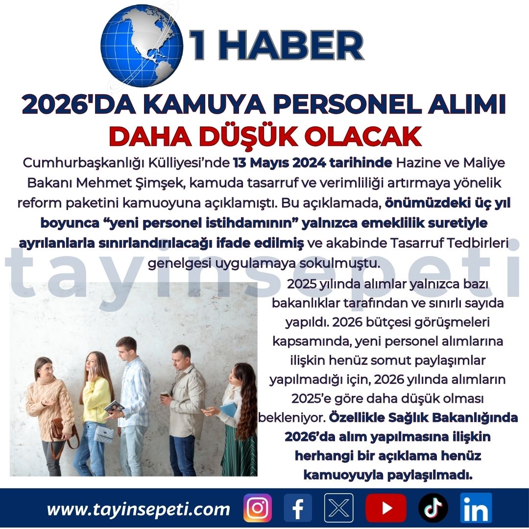 2025 yılında alımlar yalnızca bazı bakanlıklar tarafından ve sınırlı sayıda yapıldı. 2026 bütçesi görüşmeleri kapsamında, yeni personel alımlarına ilişkin henüz somut paylaşımlar yapılmadığı için, 2026 yılında alımların 2025’e göre daha düşük olması bekleniyor. Özellikle Sağlık Bakanlığında 2026’da alım yapılmasına ilişkin herhangi bir açıklama henüz kamuoyuyla paylaşılmadı.