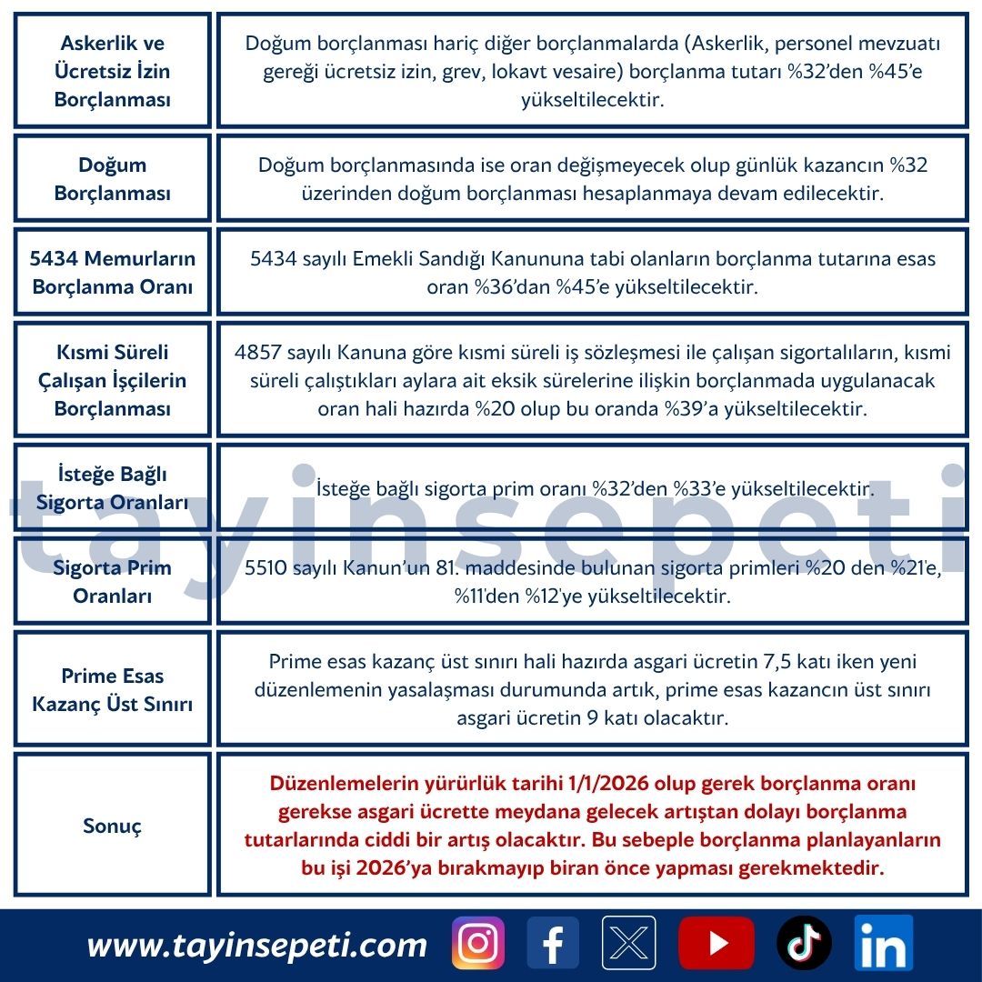 Düzenlemelerin yürürlük tarihi 1/1/2026 olup gerek borçlanma oranı gerekse asgari ücrette meydana gelecek artıştan dolayı borçlanma tutarlarında ciddi bir artış olacaktır. Bu sebeple borçlanma planlayanların bu işi 2026’ya bırakmayıp biran önce yapması gerekmektedir.